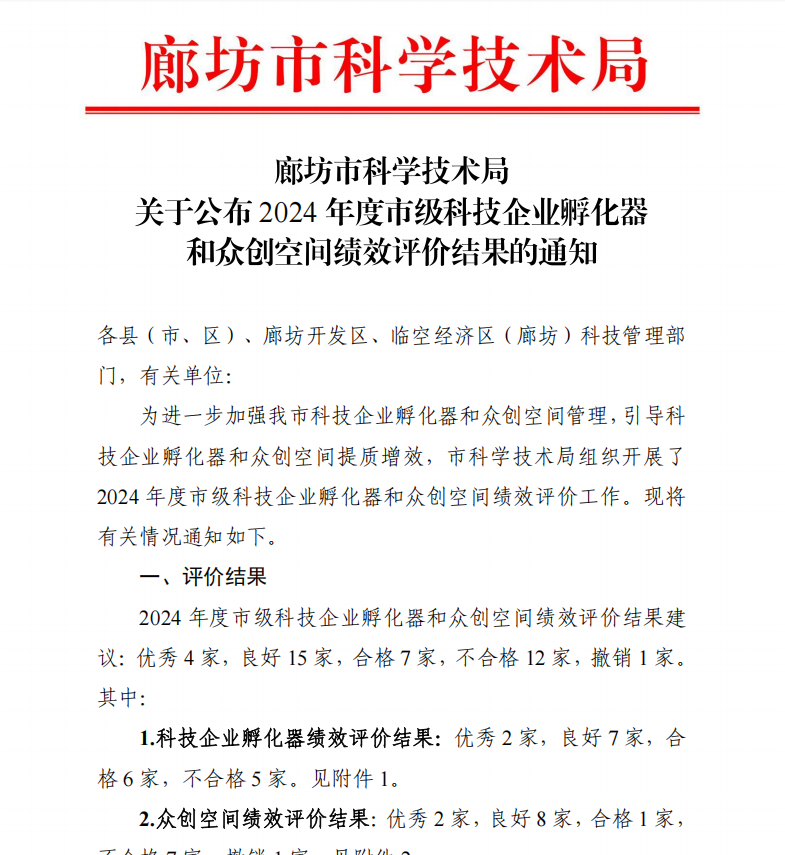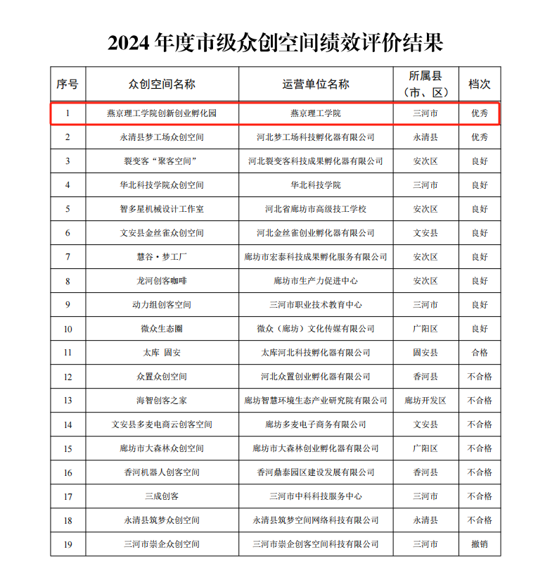 近日,廊坊市科学技术局发布了《关于公布2024年度市级科技企业孵化器和众创空间绩效评价结果的通知》,燕京理工学院众创空间凭借特色孵化成效,蝉联“优秀”等级。
