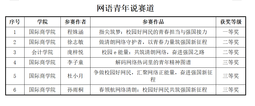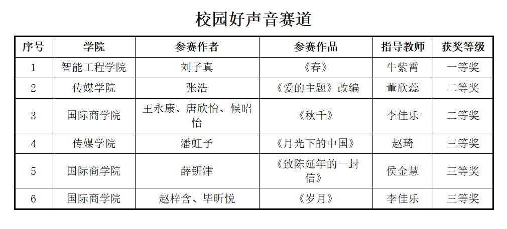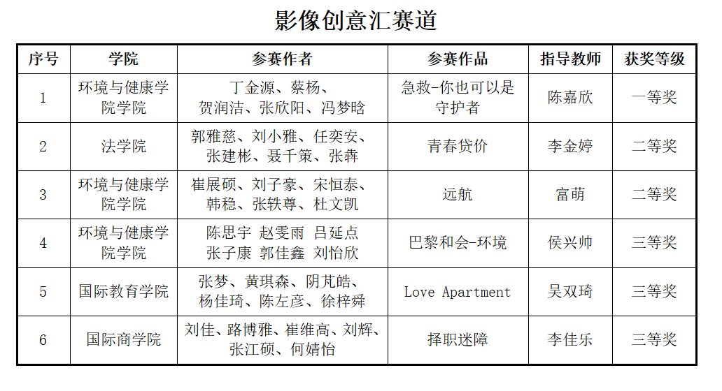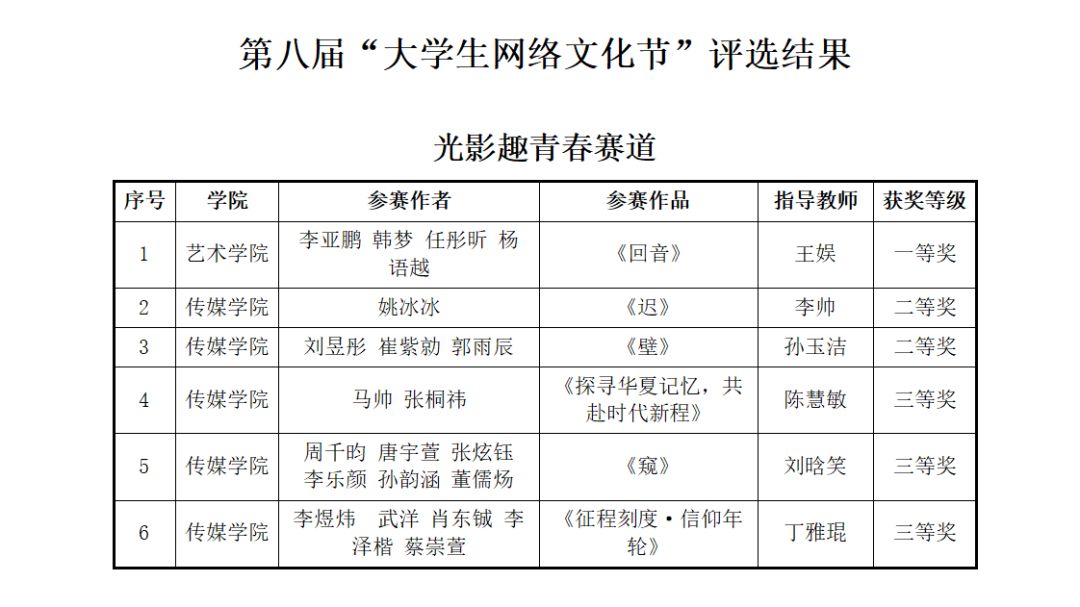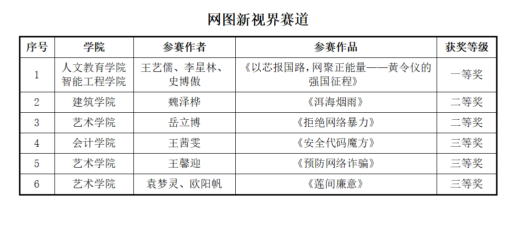 根据《燕京理工学院关于举办第八届大学生网络文化节和网络教育优秀作品推选展示活动的通知》要求,经各学院初评申报、学校集中评选,共评选出大学生网络文化节活动光影趣青春、影像创意汇、网图新视界、网语青年说、校园好声音、网创梦工厂、数智新技艺7个赛道各一等奖1项、二等奖2项、三等奖3项;网络教育优秀作品推选活动网络优秀文章4项;优秀工作案例5项、优秀微课3项、优秀新媒体赛道4项,现对评选结果予以公示(具体评选结果见下图)。